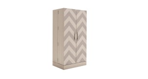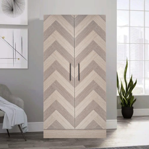 Cabinet doors feature a chevron pattern with sand oak and mocha elm veneers.