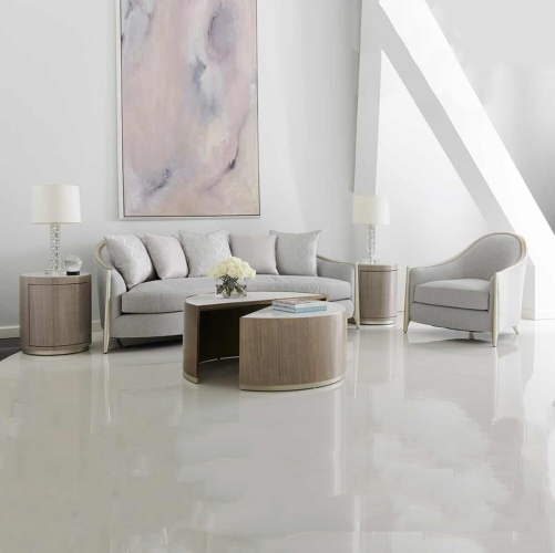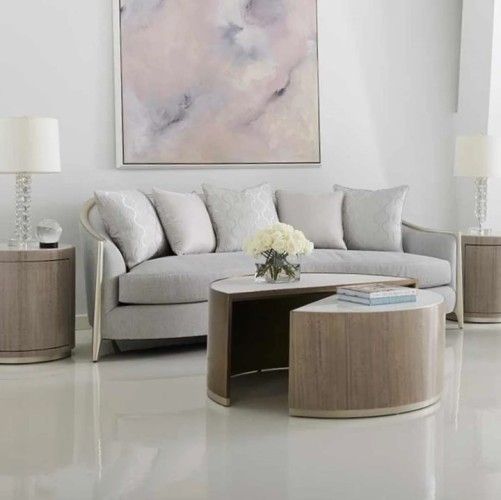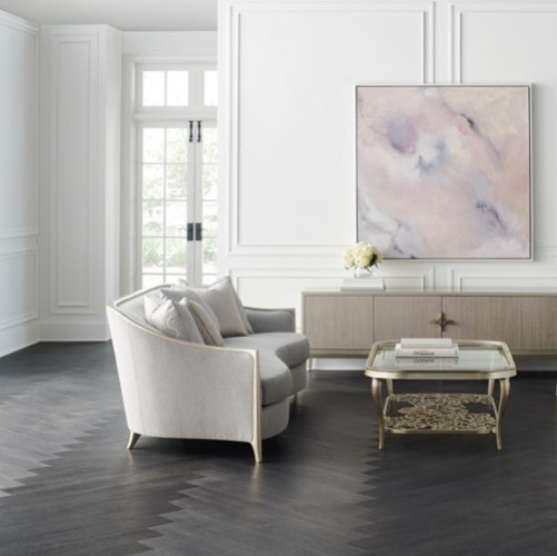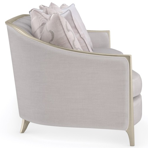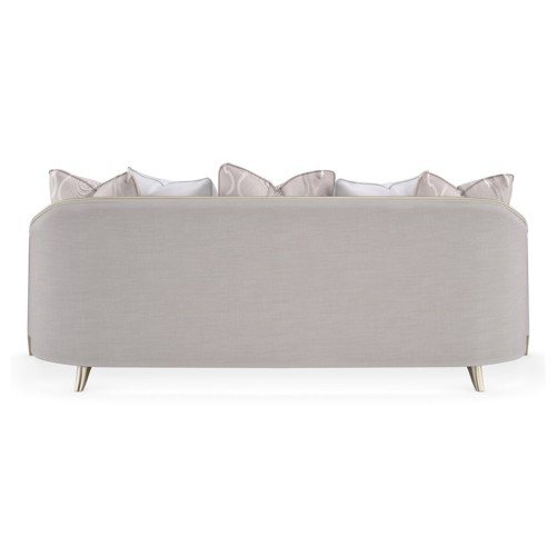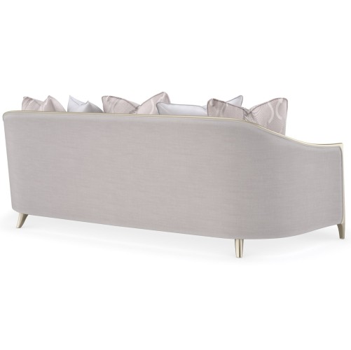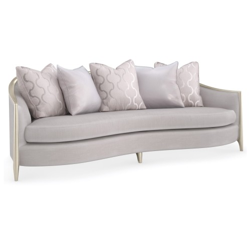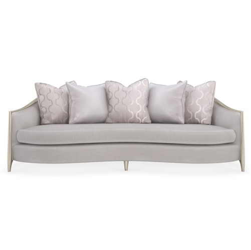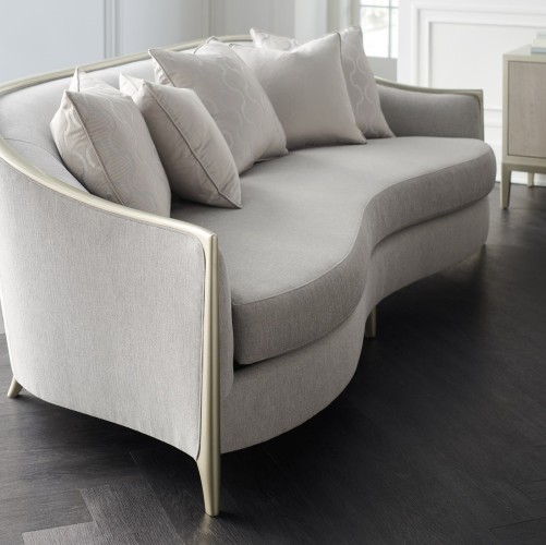 With a graceful, flowing shape, this timeless sofa draws on the iconic French curve for design inspiration. Classic details include a gently bowed bench seat and exposed wood frame, finished in a Silver Shadow paint for a modern take. Soft and sophisticated in a slate-colored performance chenille with a metallic thread, it introduces a whisper of indulgence to living interiors. Accent pillows in a woven ogee pattern and shimmering satin add a luxe finishing touch.