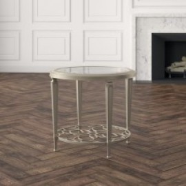 Add everyday elegance to any space with this open and airy round cocktail table. It features a round lower shelf boasting a delightful metal fret work design in a pleasing open graphic pattern. A round glass top with 1.25" bevel is supported with metal legs and creates a space for storage and display. Light in appearance yet substantial in construction, this distinctive beauty wears a finish of Taupe Paint highlighted with Taupe Silver Leaf.
