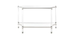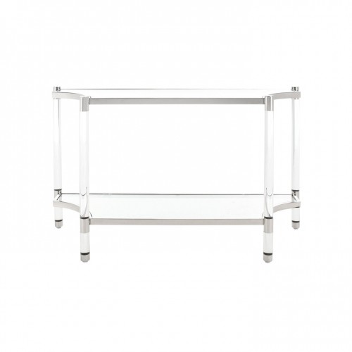 Polished stainless steel framed top and shelf with inset, tempered glass. Acrylic posts sections with polished stainless steel caps and feet. Adjustable glides. Anti-tip kit. Dimension :W 153CM D 46CM H 77CM Material : Glass and Steel Weight : 24Kg by Malindafurniture