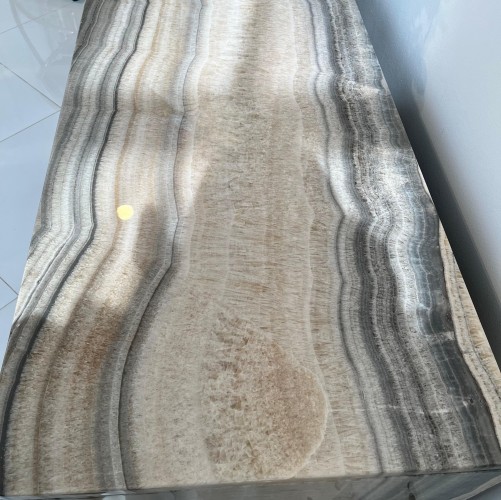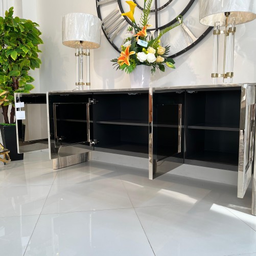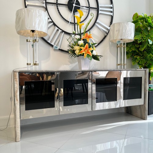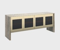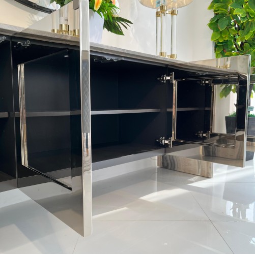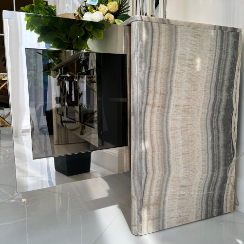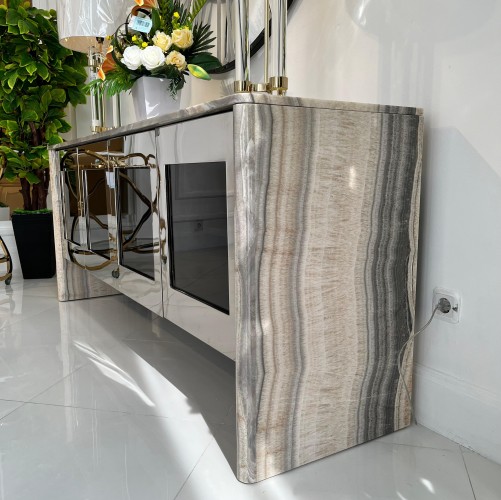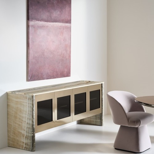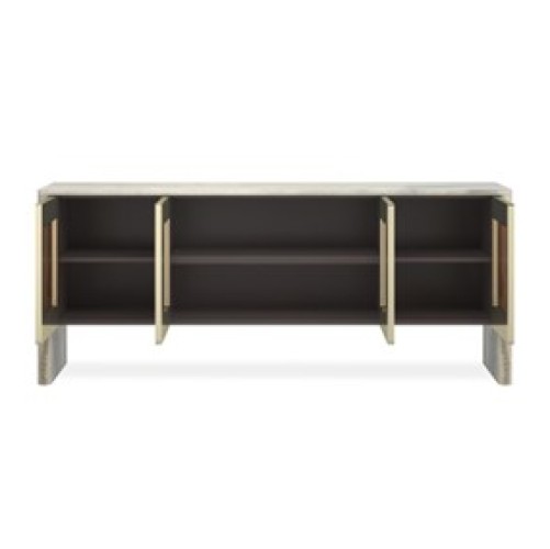 Sojourn gives off a 70s retro vibe with its “big look.” Immediately, your eyes are drawn to the large slabs of Grey onyx marble that create the legs and top of the sideboard. Inset into the stone frame are four metal doors that create Whisper of Gold frames for the inset Bronze glass front panels. Open the touch-latch doors to discover an interior finished in luxurious painted seal skin. There is an adjustable shelf behind each end door; and one adjustable shelf behind the center doors.