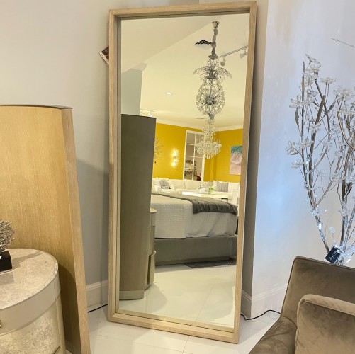 Rectangular wood-framed floor mirror in Dune finish with inset, non-beveled mirrored glass