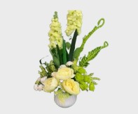 Spruce Mix Green Yellow White Premium Round Arrangement, White Vase