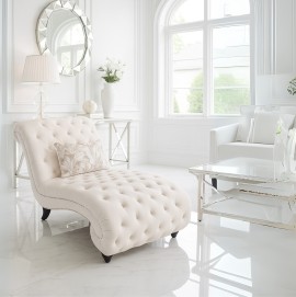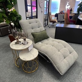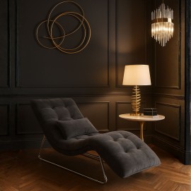 The Saint Charles Chaise invites you to recline in luxury. Its form, an elegant curve upholstered in chenille fabric, offers a sumptuous retreat. The piece is designed with a unique, sculpted silhouette, including a plush, channel-stitched seating that wraps around to cradle you in comfort, making it a striking addition to any room.