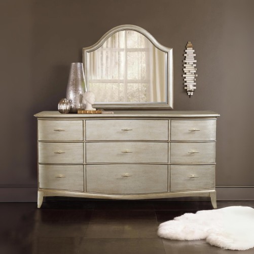Full-on glamour: the serpentine front nine-drawer Starlite Dresser has jewelry-like gold toned drawer hardware and a silver painted finished that has been brushed with glaze for warmth and gentle aging.