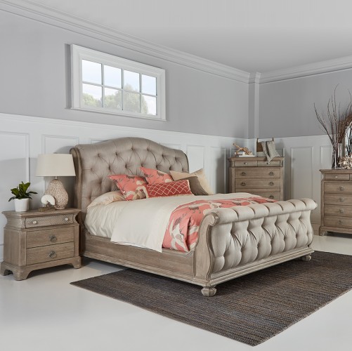 The popular Chesterfield style is rendered in a grand scale on this deeply tufted Summer Creek Shoals Upholstered Tufted Sleigh Bed by ART Furniture. The wavelike footboard scrolls and softly curving headboard, both upholstered in stain-protected neutral fabric, are elevated by a molded frame and tapering ball feet.