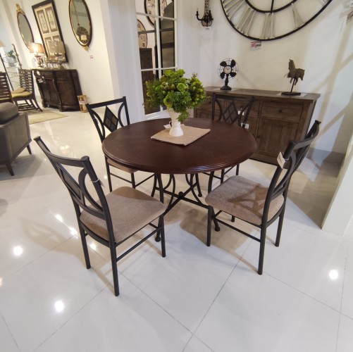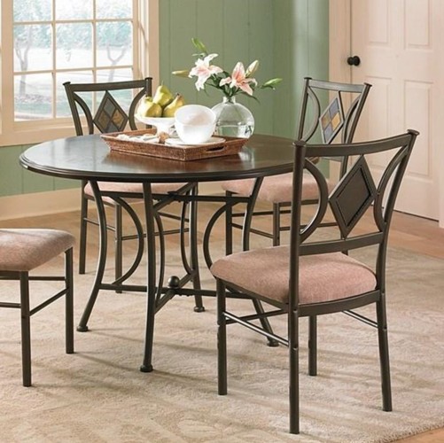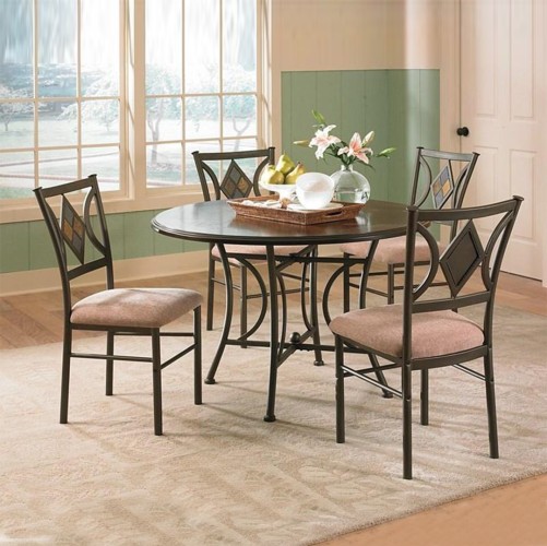 The tacoma side chair by Steve Silver Furniture features diamond shaped faux slate inserts, upholstered seats and stretchers, metal base and dark oak finish.