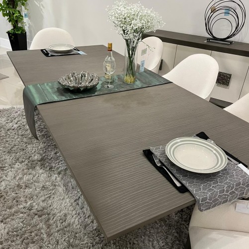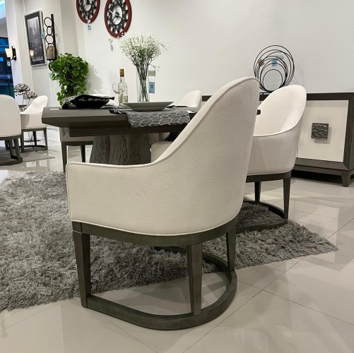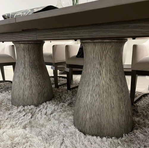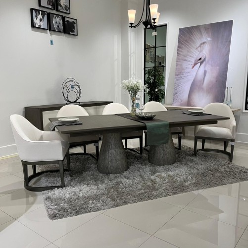 Angular modern shapes, organic textures and mixed materials combine with a gray, cream, and metallic color palette to create a crisp modern look in the Terra Luna Dining Table from the Terra Luna Collection. The deeply wire-brushed Nightfall finish gives a tactile, dimensional texture, contrasting with the metallic-finished table base. The clean silhouettes paired with natural color tones and organic textures give a minimalist yet inviting appeal.