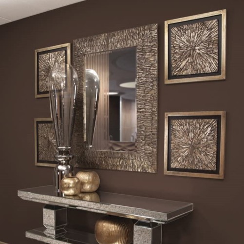 This great art work set features a square wood frame. The main focus of the piece is characterized by a defined bark texture with a black trim. The frame and art is then finished in a metallic champagne silver that is covered in a black wash that accentuates the texture. Alone or grouped in multiples, this wall art is a perfect accent piece for an entryway, bathroom, bedroom or any room in your home. D-rings are affixed to the back of the piece so it is ready to hang right out of the box.