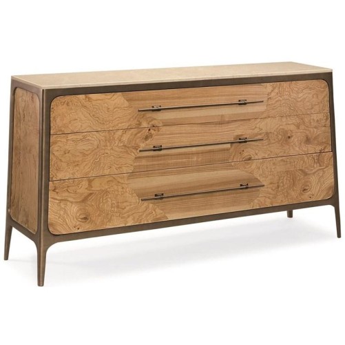 Everyone loves the bliss that comes from being organized. Bring essential storage to your favorite space with this earthy five-drawer chest. Offering sleek, mid-century lines and a handsome Olive Ash Longwood veneer, this versatile chest offers layers of natural textures that will look great in a variety of environments. A Dark Bronze Metal frame accentuates the chests trapezoidal shaping. This beautifully designed three-drawer chest makes organizing easy.