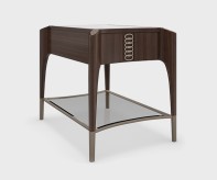 A rich Stallion finish emphasizes the linear wood grains of Sapele veneers, contrasted by a creamy Kararagin stone top with marble-like gold veins. Carved, interlocking rings add an element of distinction to Oxford’s statement of strength and resilience. Features a single soft-close drawer and beveled glass shelf framed in Pyrite-painted metal.