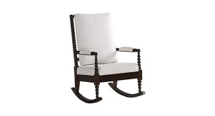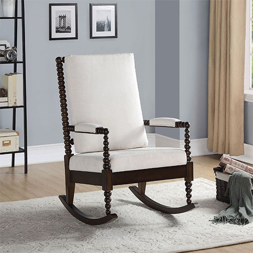 Unique blend of traditional feel with a contemporary touch that will bring stylish appeal to any living space. This beautiful accent chair has a rich wooden frame and is upholstered in lush cream fabric. This stylish wood chair features a distinctive turned back and armrests with full foam cushion back and seat providing the ultimate in comfort. Whether you\'re adding to an existing seating group or creating a new one, this beautiful and functional piece will be a tasteful addition to your space.