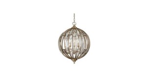 A statement of sumptuous elegance, a sphere of beveled crystals enhanced with burnished silver champagne leaf finish, presenting a modern update of traditional sophisticated elements. Includes 15' wire and 7' chain for adjustable installation.