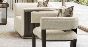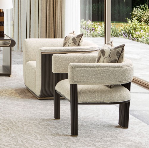 Sculptural and sophisticated, the West Kensington Accent Chair is a striking fusion of modern design and timeless luxury. Wrapped in a plush chunky woven fabric with multi-hued yarn, its soft texture complements the bold, architectural silhouette. Espresso-finished reeded legs lend a sense of depth and refinement, while gleaming gold trim adds a hint of understated glamour. A feather-filled chenille jacquard pillow enhances the chair’s tailored elegance, making it the perfect statement piece for any refined space.