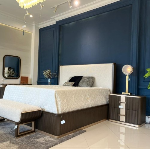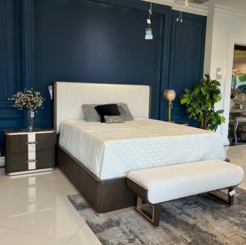 The West Kensington Bed is a masterpiece of modern refinement, where exquisite craftsmanship meets effortless luxury. Wrapped in a sumptuous, multi-hued woven fabric, the headboard's plush texture offers an inviting retreat, while its subtle wingback silhouette exudes tailored elegance. A sculptural espresso-finished frame, adorned with intricate reeding, creates striking architectural depth, enhanced by a radiant gold-trimmed base. Designed for contemporary indulgence, discreet USB ports blend innovation with sophistication, ensuring both style and convenience in your sanctuary.