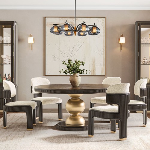 Graceful in form and rich in detail, the West Kensington Round Dining Table is an elegant blend of modern design and timeless sophistication. The deep finished tabletop features a striking sunburst pattern, adding depth and refinement. A sculptural pedestal base, adorned with a bold gold-accented sphere, creates a striking contrast while maintaining a sense of balance and artistry. The delicate reeding along the tabletop apron and base trim enhances its architectural presence, reinforcing the collection’s signature design. With its petite silhouette, this table is perfectly suited for intimate dining spaces.