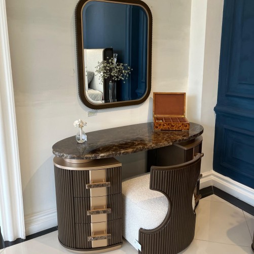 Indulge in the refined elegance of the West Kensington Vanity Desk, where sophisticated craftsmanship meets modern luxury. Designed to elevate your daily rituals, this vanity boasts a rich espresso finish accentuated by intricate reeding and luminous gold details. The gracefully curved silhouette is topped with a stunning Emperador marble surface, adding an opulent touch to your space. Thoughtfully designed for both style and function, its velvet-lined drawers provide effortless organization, while discreet LED-lit top drawers illuminate upon opening, ensuring an exquisite beauty experience.