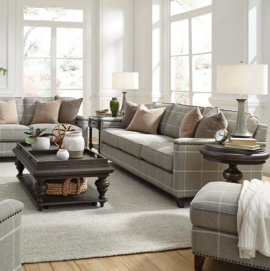 Winslow embodies the timelessness of plaid and clean design. This traditionally inspired loose seat and back upholstery collection gets a youthful update with a taupe matched plaid upholstery and a thin squared off, extended arm. Just the right amount of antique brass nail head trim to confirm classic pedigree outlines the arm while shaped block feet keep the look fresh and current.