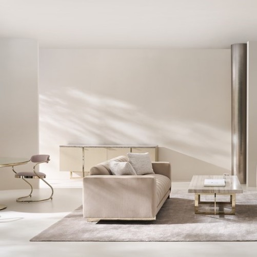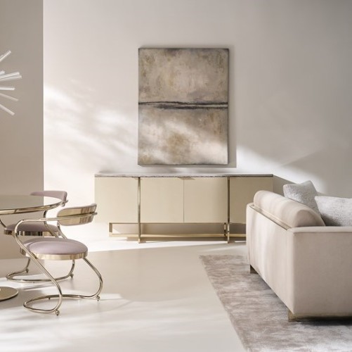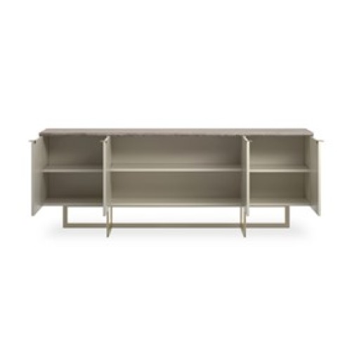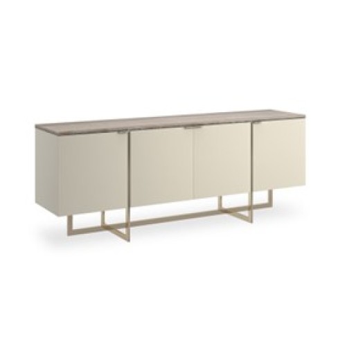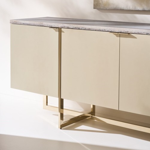 Stone, mirror-polished metal and hardwoods crisscross in this sleek media cabinet with linear appeal. Flowing Sandstone graces the 84” top of the Pearl-painted cabinet and four doors. The paint gives off just enough luster to make the piece intriguing. The doors have slim Whisper of Gold pulls. Adjustable shelving and wire access graces the inside of the cabinet. The base is the real stunner of the piece with thin intersecting bars in mirror-polished Whisper of gold that overlap each other and extend up the cabinet to add interest.