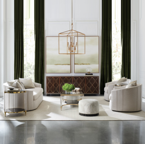 Complete an intimate space for conversation or larger area for entertaining with this sheltering sofa, perfect on its own or in pairs. Fine tailoring and pleated seams add a sophisticated note to its gently rounded frame, which appears to float on a recessed plinth base. Dressed in an easy-care chenille performance fabric with a luxuriously soft hand, it’s the epitome of casual glamour. A tactile mix of throw pillows finishes the look with a hint of shimmer and pop of color in a painterly floral pattern. Pleated seams add a subtly sophisticated detail to this softly rounded swivel chair, finely tailored in an easy-care chenille performance fabric. An elevating addition to any seating area, its gracefully curved silhouette appears to float atop a recessed plinth base in an Almost Black finish. A feather down pillow in shimmering satin adds a luxe finishing touch. construction ; 8-way hand tied seat, Springdown cushion and Feather down pillow.